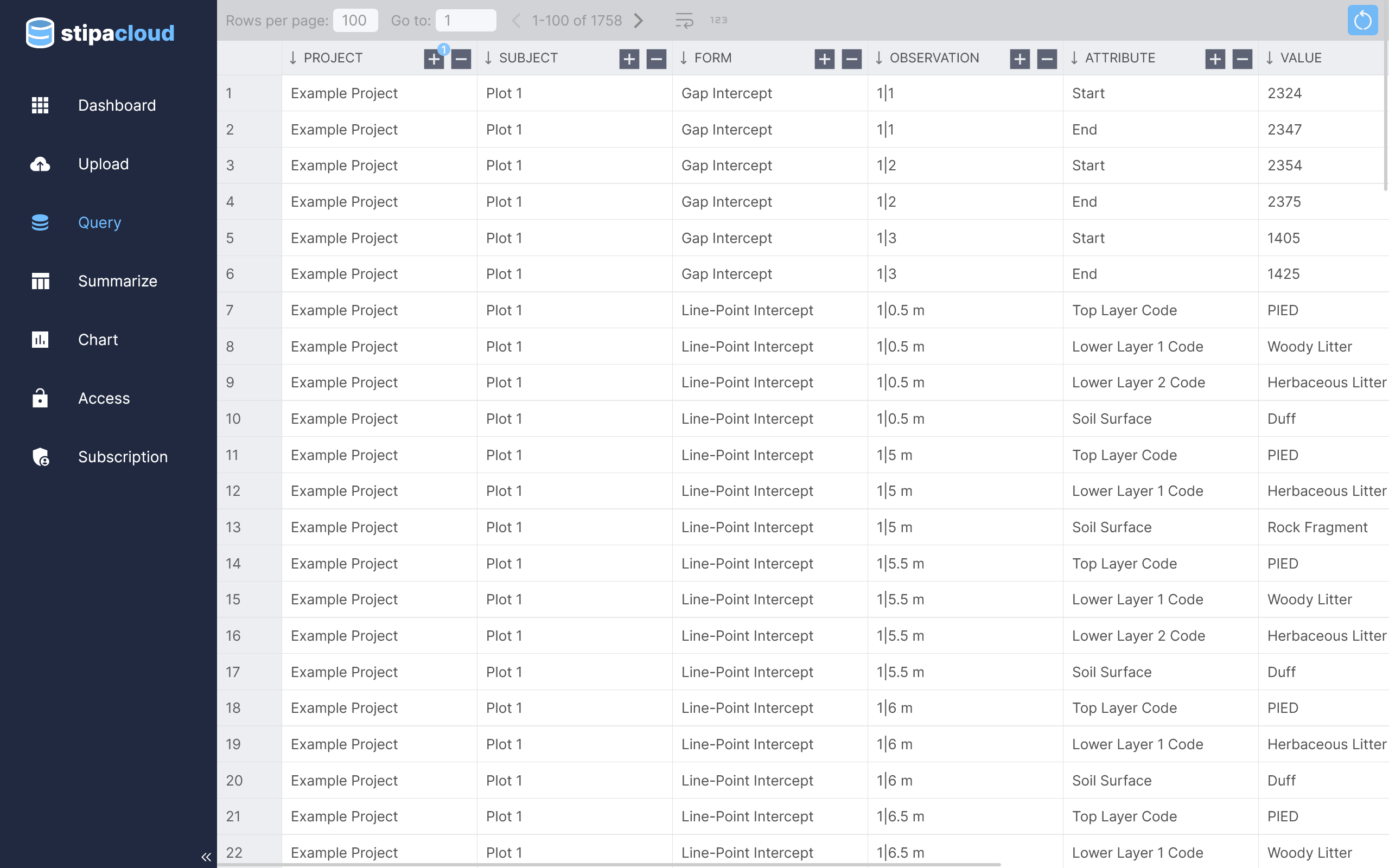 Stipa Cloud is designed around the Stipa Data Collection Specification, which provides a highly portable way to maintain data structure throughout the data life-cycle, from field measurement, to storage, to analysis. Rather than recreating data structure every time you migrate your data to a new system, our approach is to have the data structure move with your data. Structure is defined before you collect your data and never again (read up on the scientific method to understand why this is important). The result is a seamless data management experience where all of your field data can be stored and administered in the same place, while keeping the original structure intact to maintain data integrity and facilitate interpretation.