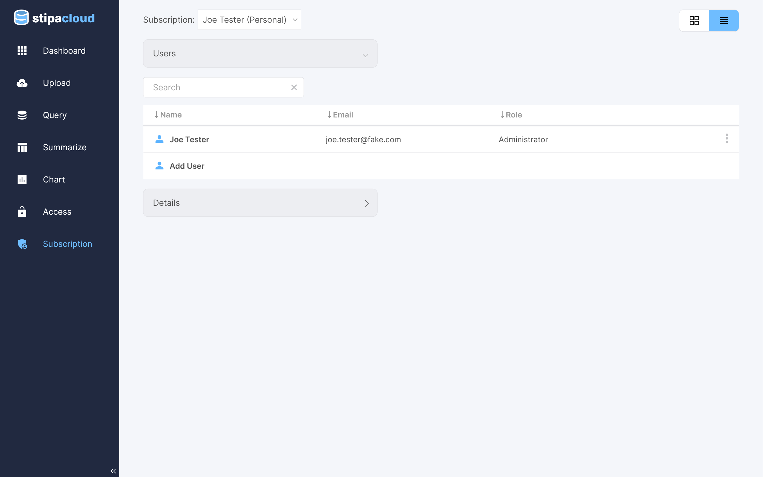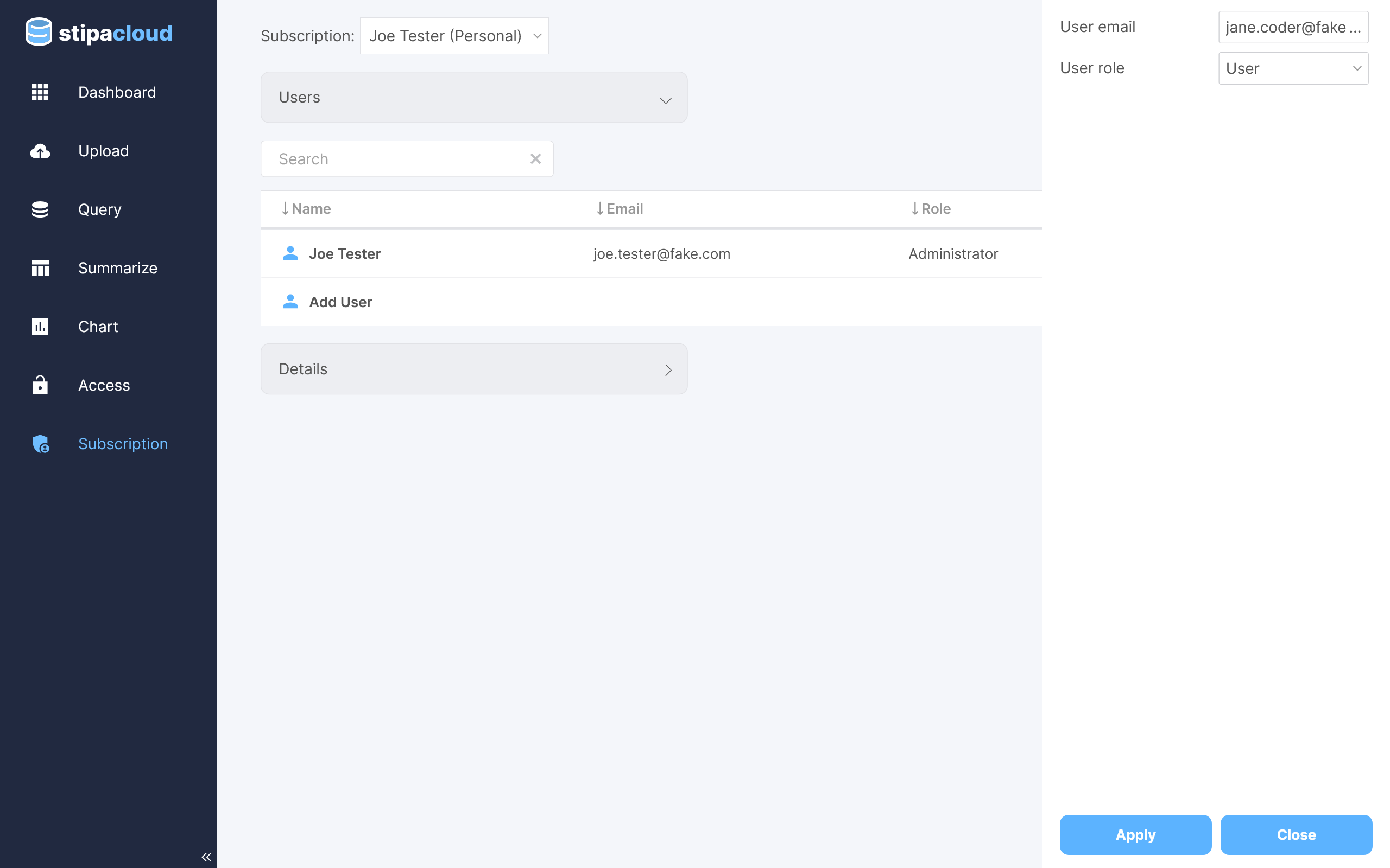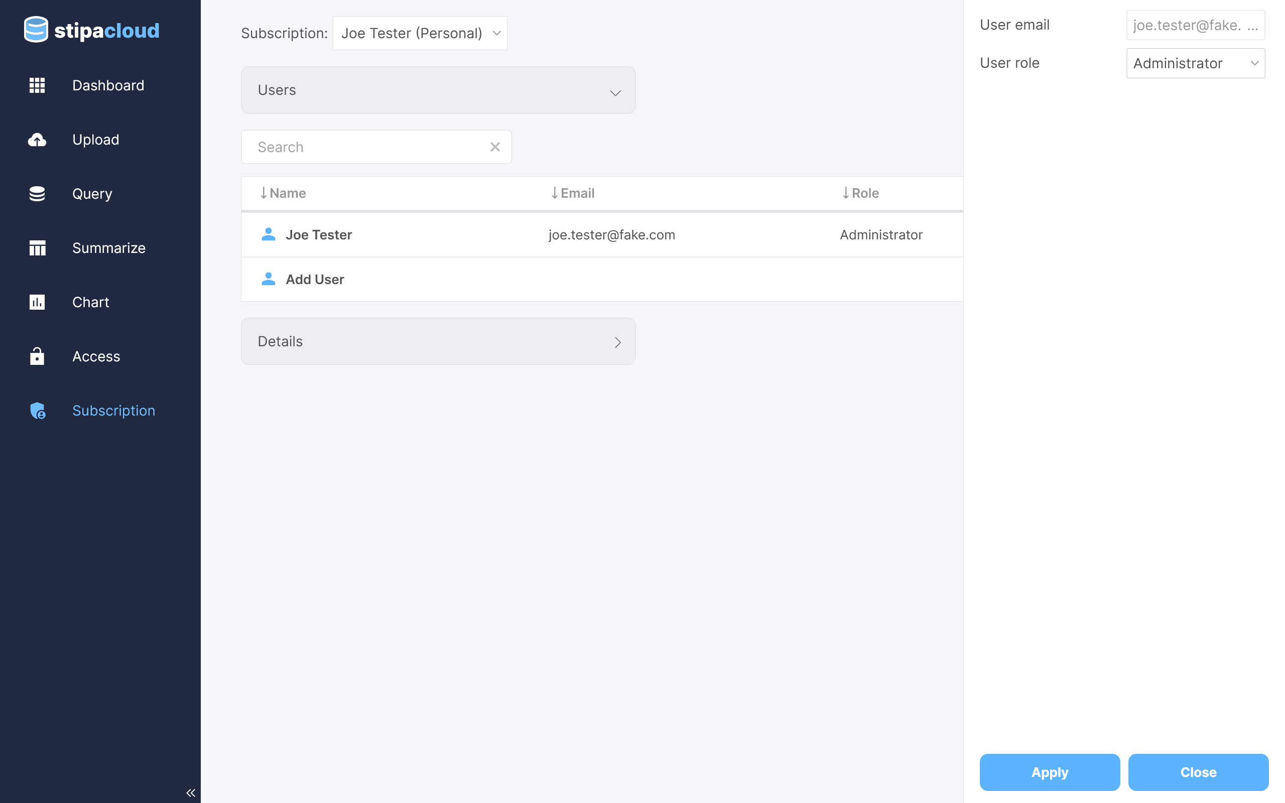 Click on the Add User button to open a toolbar for adding a new user to the subscription. Enter their email address and desired role and click Apply. An invitation will be sent to their email address asking them to confirm their desire to join the subscription. Only individuals with an existing Stipa Cloud account can be sent an invitation.