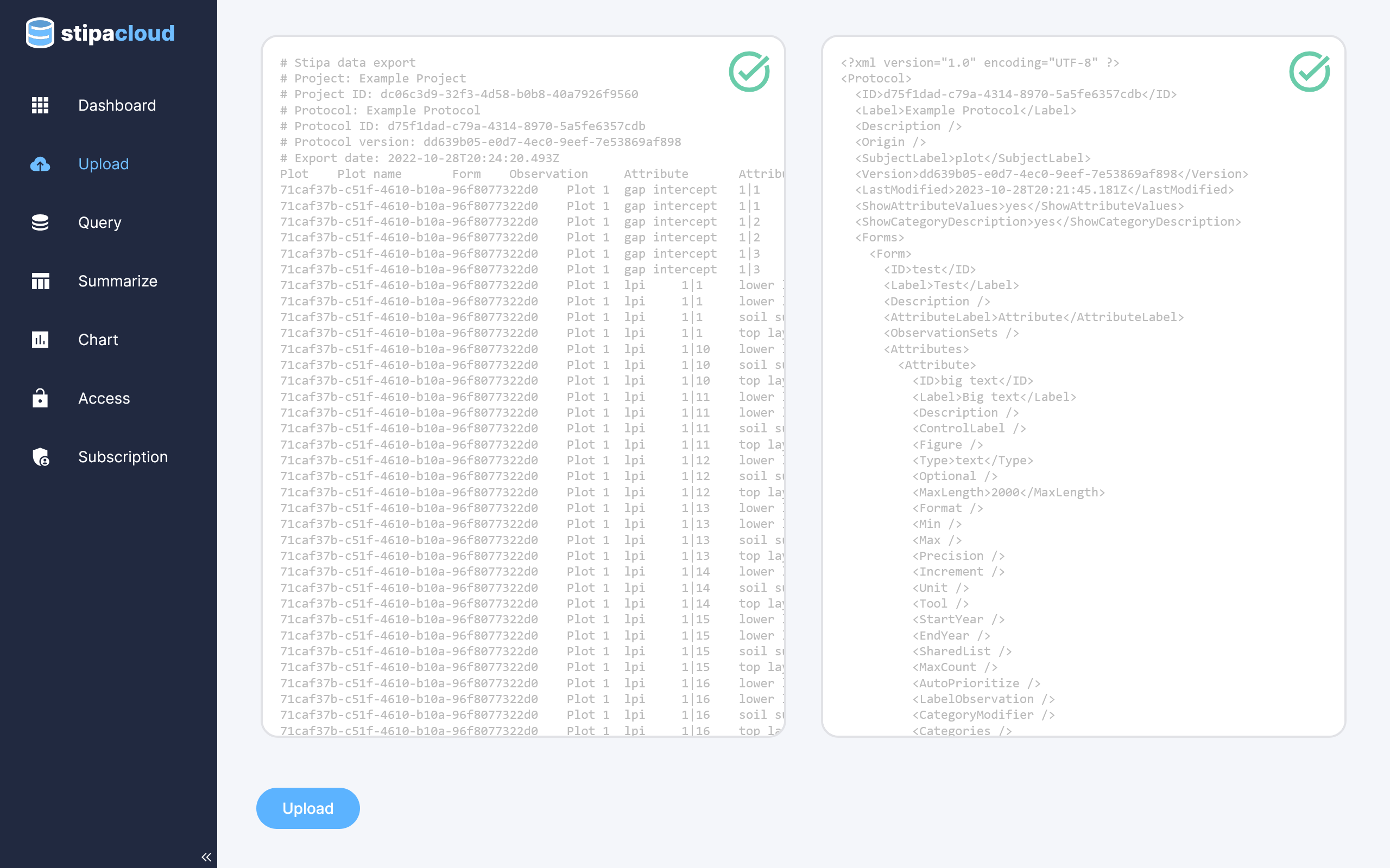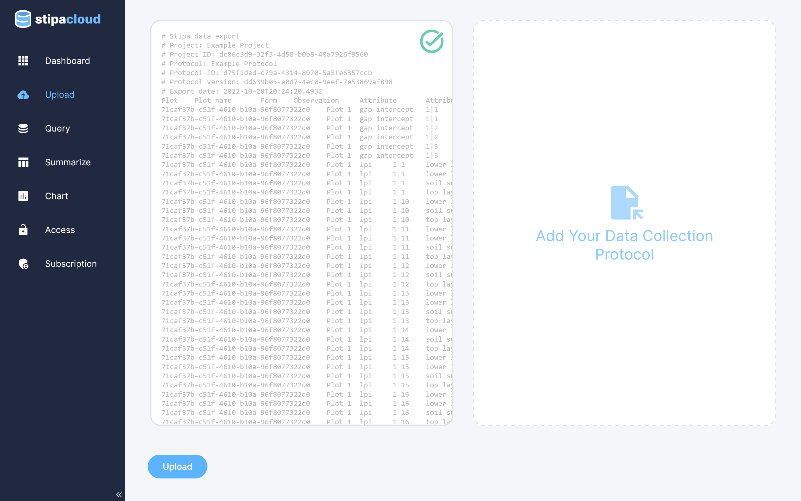 Stipa Cloud will automatically check that the added data are consistent with the added Stipa Data Collection Protocol. A green check mark will appear if the Stipa Data Collection Protocol is correctly formatted and the data are successfully validated.