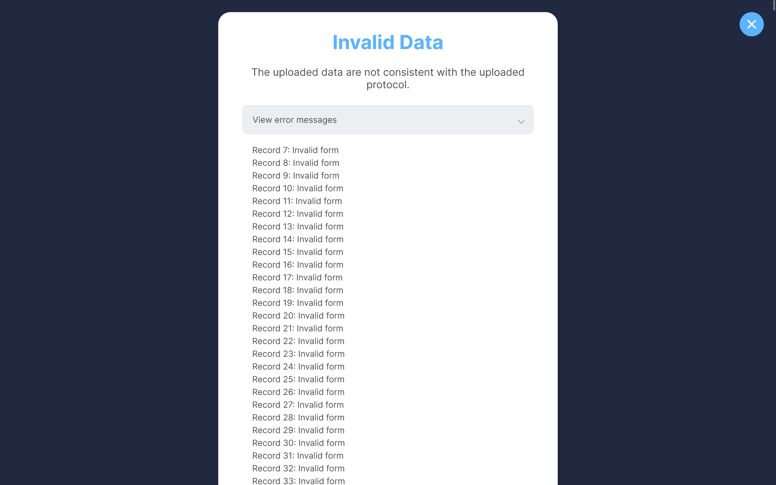 Any inconsistencies between the data and Stipa Data Collection Protocol will result in a dialog box being displayed. Click on the View Error Messages accordion to view where each validation error occurs in the data.