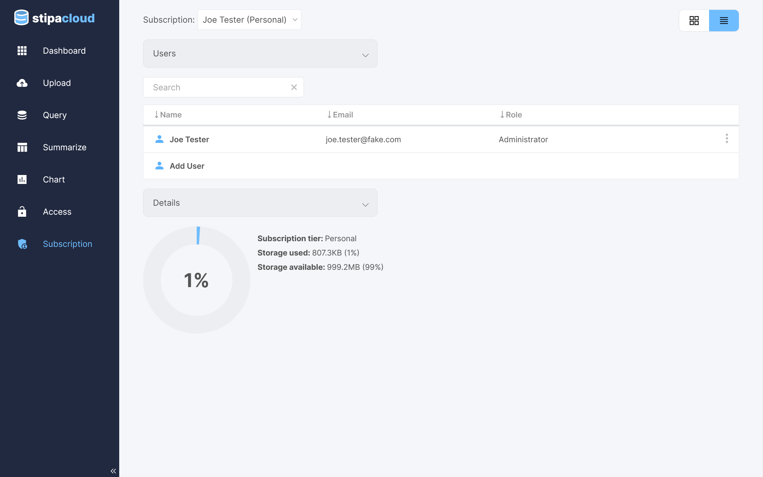 Projects are assigned to the Stipa Cloud subscription that is active when the Project is first created. Data for these Projects will be included in the storage usage of that subscription. To change the active subscription, navigate to the Subscription view and select the desired subscription from the menu at the top of the view. The selected subscription will remain active until another subscription is chosen, even after logging out of Stipa Cloud.